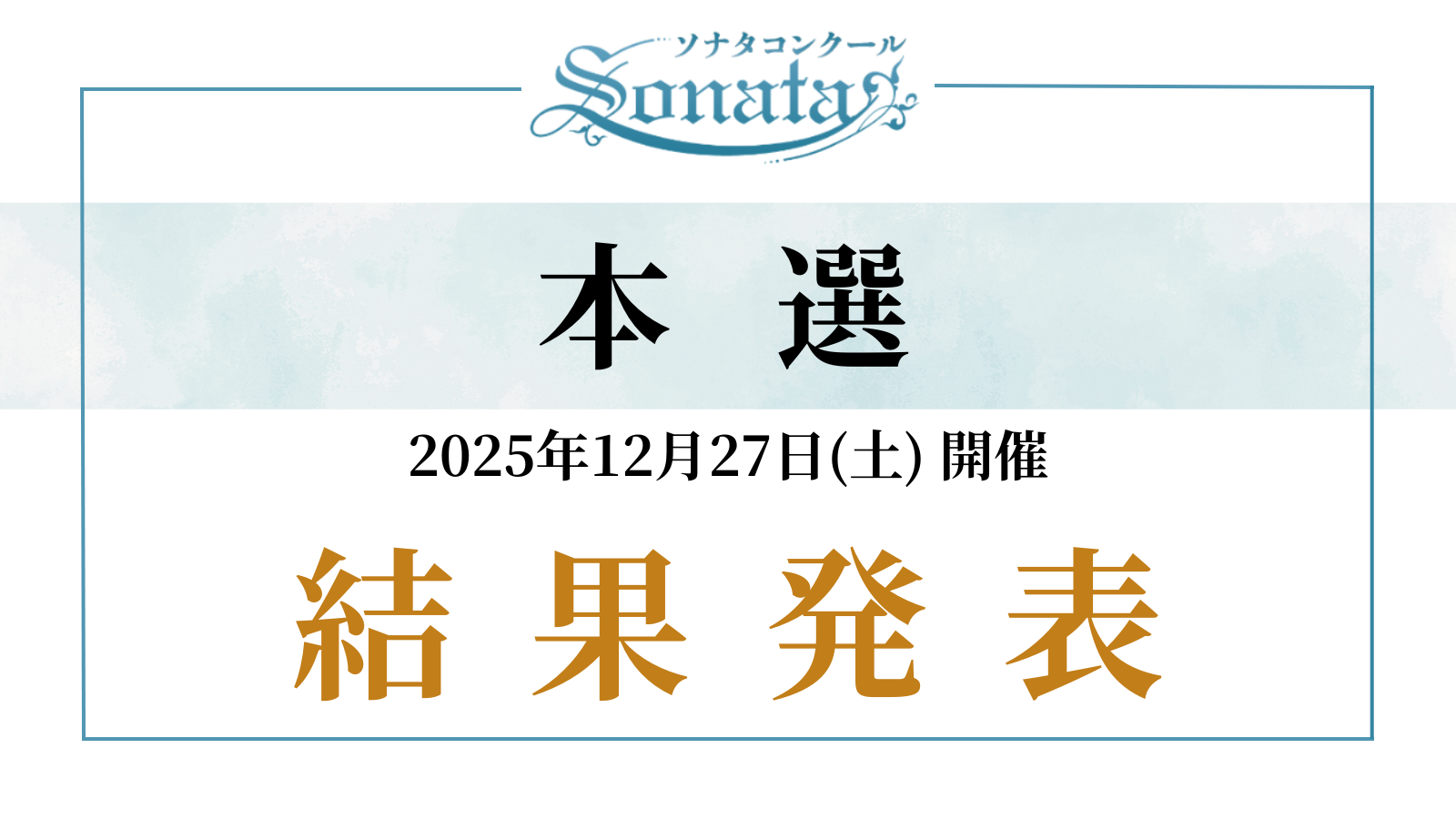 【結果発表】本選1日目(ソナチネ部門・ジュニア育成部門・ソナタ単楽章部門) 本選(1日目)の結果を公開しました 第10回ソナタコンクール本選(1日目)の結果を発表いたします。 本選 結果 コンクールに関するお問い合わせは、下記お問い合わせフォームよりお問い合わせください。 お問い合わせフォームへ -------------------- 各種SNSでもソナタコンクールのお知らせを更新しております! 各アイコンをタップして、是非お友達登録をお願いいたします。 2025/12/27 シェア